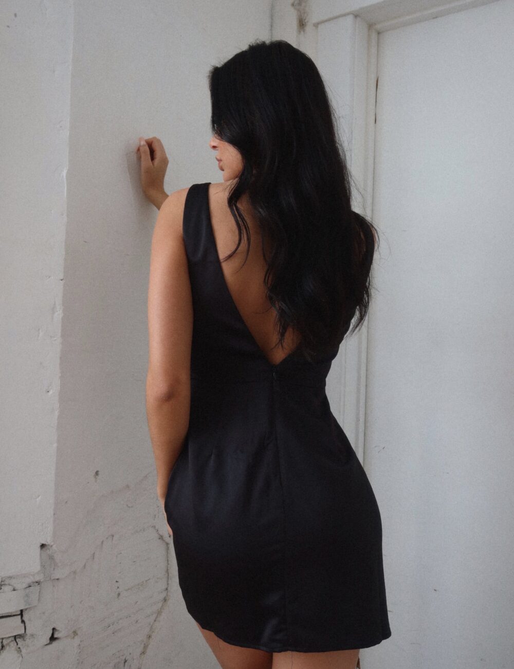 Our Karsyn Satin Corset Mini Dress is a thin straps, open back corset bodycon mini dress. This dress is made of satin material, with a square neck neckline, tank straps that lead to a deep v open back. This dress is completed with a center back hidden hook and eye zipper closure.Â